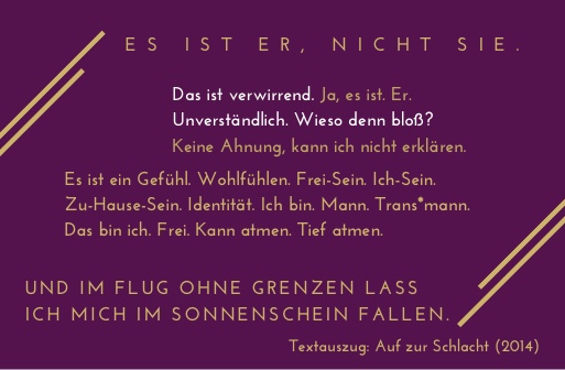 Meine Texte geben Einblicke in die alltägliche und außergewöhnliche Erlebniswelt eines transgeschlechtliche Menschen. Sie berichten, empowern, lassen verständlich werden und regen zum Dialog an. Zu den Texten